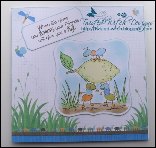 This one is for a farmers wife friend and I just loved these penny black cows all stood at the farm gate in their Sunday best outfits. Tragically I seemed to have thought it funny to print out a sentiment saying Happy Birthday to Moo! What was I thinking of ……. both images are coloured with promarkers.