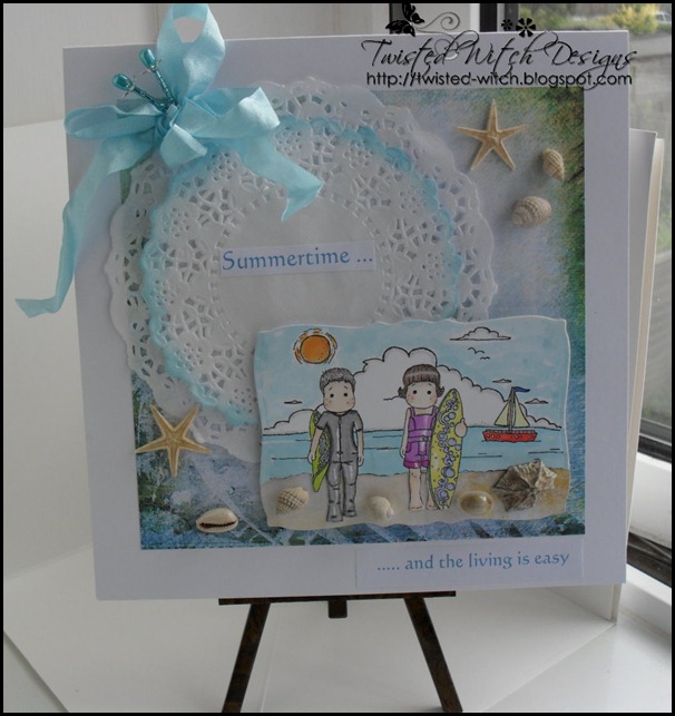 For my image I have combined three Magnolia stamps to create a beach Scene, Edwin and Tilda surfing and the beach backgound. I have coloured it with promarkers and the beach was paper pieced on from a beach background paper. The shells are from my stash as are the fabulous and real little starfish. I made the hat pins from some pearl headed pins and beads, using an earring back to hold it all in place on the pin. The sentiment has been printed onto safmat.